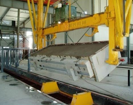 加氣磚翻轉(zhuǎn)吊具是加氣混凝土生產(chǎn)線中的主要配套設(shè)備。屬于加氣混凝土設(shè)備的重要組成部分,吊具將坯體吊放在切割臺(tái),脫去???,坯體即能切割。 加氣砌塊自動(dòng)吊具:與雙梁雙勾吊車配套,用于脫模、吊運(yùn)坯體等。結(jié)構(gòu)采用液壓推進(jìn)器,使四個(gè)掛鉤自動(dòng)張合。 翻轉(zhuǎn)吊具把模具空中翻90度后脫模把坯體連同模具側(cè)板放置在切割小車上,進(jìn)入下一步切割部分。